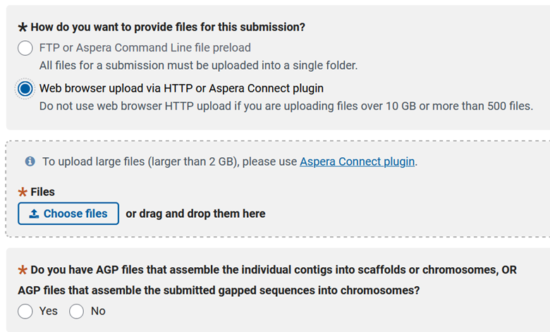 The next step is filling out the ‘FILES’ tab. In this case I was lucky that my genome was assembled into 9 complete chromosomal scaffolds without extraneous contigs. Even if your genome has all contigs integrated into pseudomolecule scaffolds, you will need to choose the second option to be able to deposit an annotation.