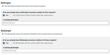 - Create Biosamples - This describes each of the biological samples that were acquired for assembling or annotating your genome.
